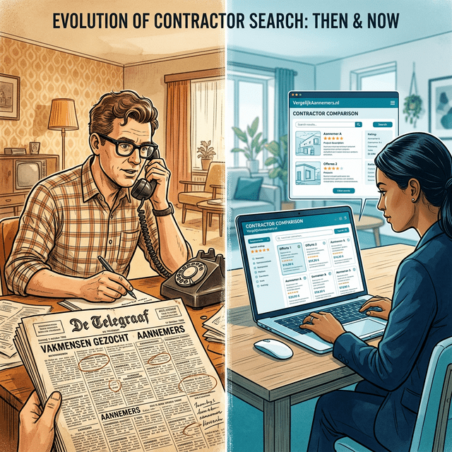 Vandaag doet je buurman hetzelfde in zes minuten op zijn smartphone. Maar hoe zijn we hier gekomen — en wat betekent de opkomst van kunstmatige intelligentie voor die reis? Dit artikel neemt je mee door de drie tijdperken van offertes aanvragen in Nederland, en legt uit waarom slimme platforms voorlopig onmisbaar blijven.
